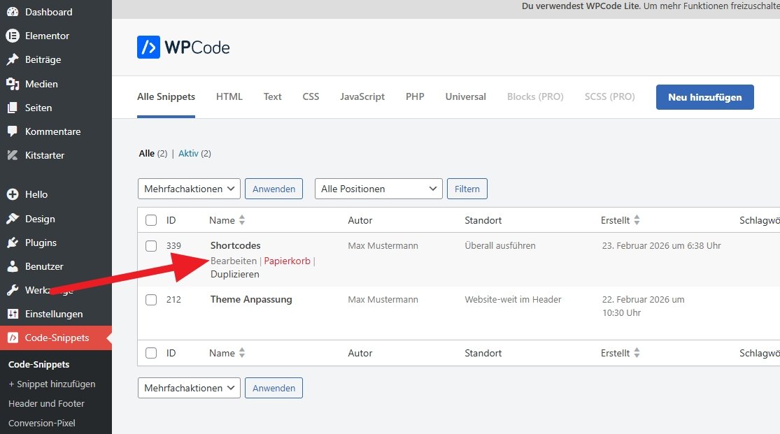 Jetzt klickst Du auf den Punkt “Shortcodes > Bearbeiten”: